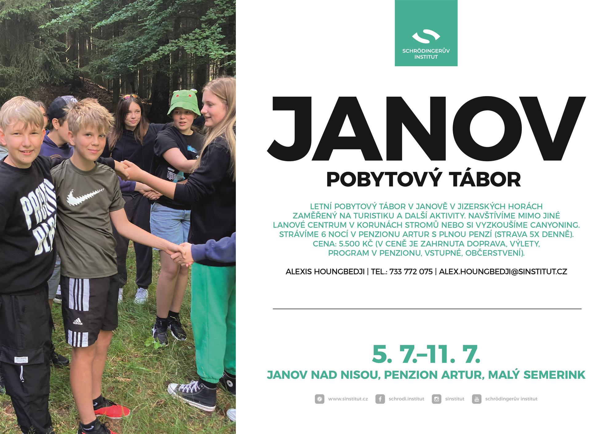 Letní pobytový tábor v Janově v Jizerských horách zaměřený na turistiku a další aktivity. Navštívíme mimo jiné lanové centrum v korunách stromů nebo si vyzkoušíme canyoning. Strávíme 6 nocí v penzionu Artur s plnou penzí.